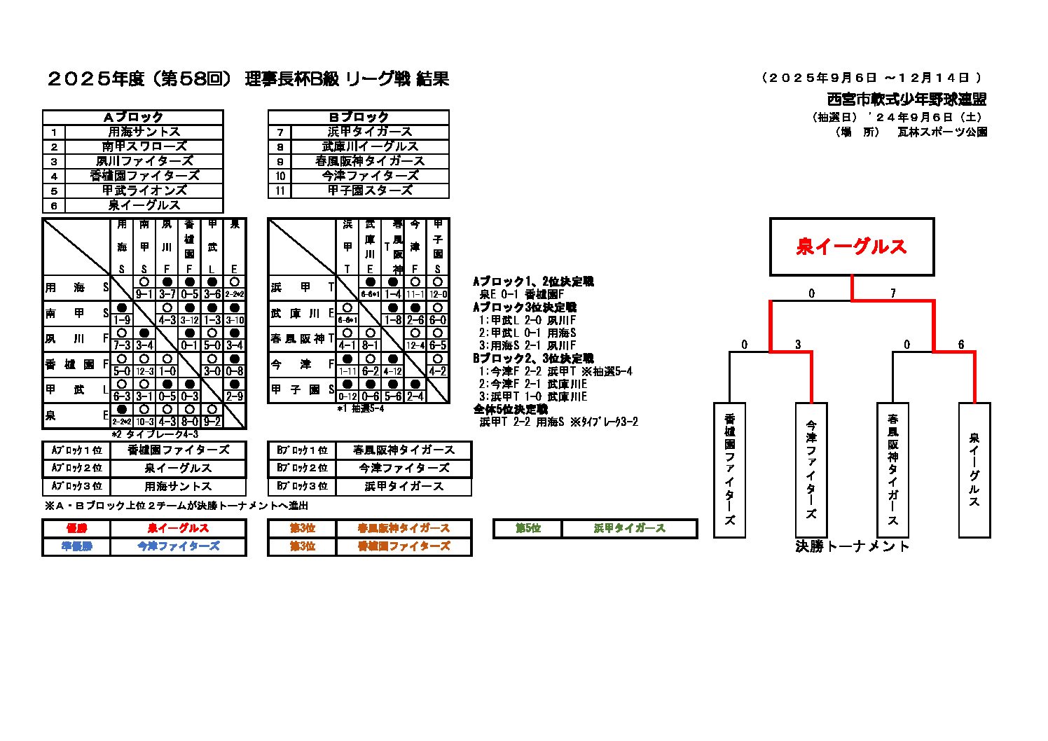 HOME > 大会成績速報 > 大会成績速報 25年度(第58回)理事長杯B級最終結果【優勝:泉イーグルス・準優勝:今津ファイターズ】 投稿日:2025年12月14日 25年度(第58回)理事長杯_B級リーグ戦_最終結果251214 優勝:泉イーグルス 準優勝:今津ファイターズ 第3位:春風阪神タイガース 第3位:香櫨園ファイターズ -大会成績速報